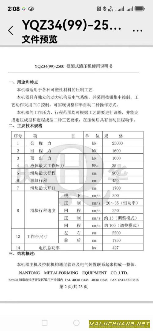 南通锻压产2500吨7液压机,数据见图,私聊 信息编号:S561817 |
